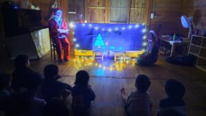 保護者による読み聞かせ「よんでよんで」クリスマス特別版。ブラックライトを使った幻想的な演出と、サンタに扮した保護者からのプレゼント。心温まるひとときをレポートします。