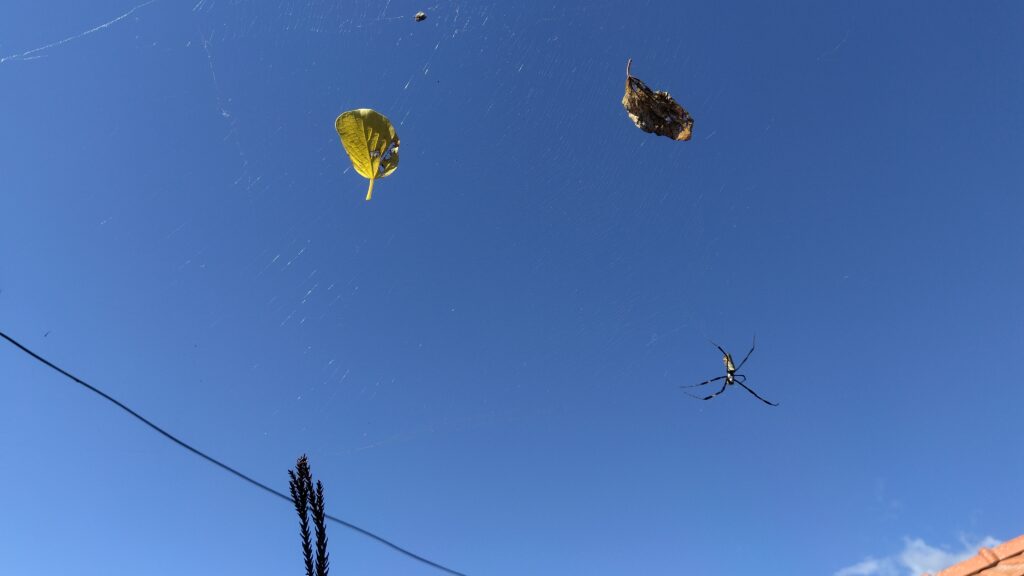 昨日の雨の後の園庭で、あちこちにクモの巣ができている。