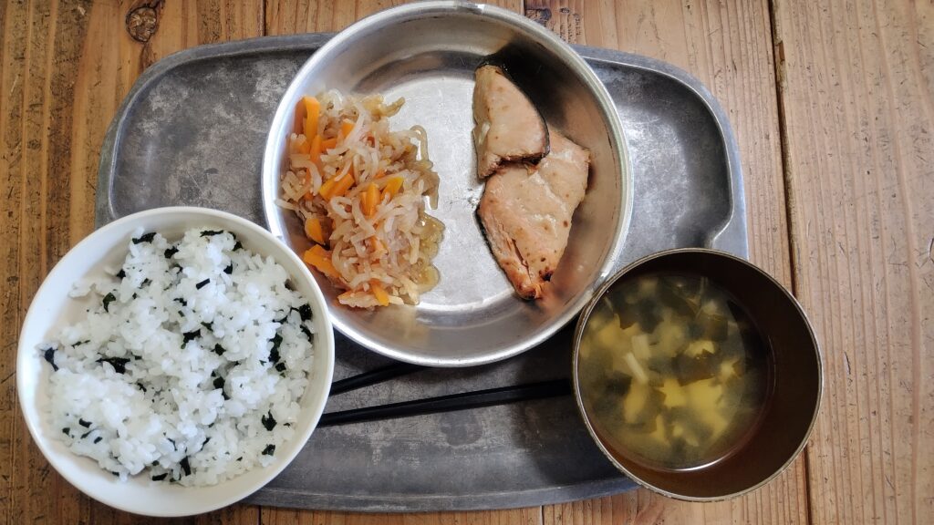 今日の給食はわかめごはん、鮭のチーズ焼き、切干大根の煮物、豆腐とわかめのみそ汁。