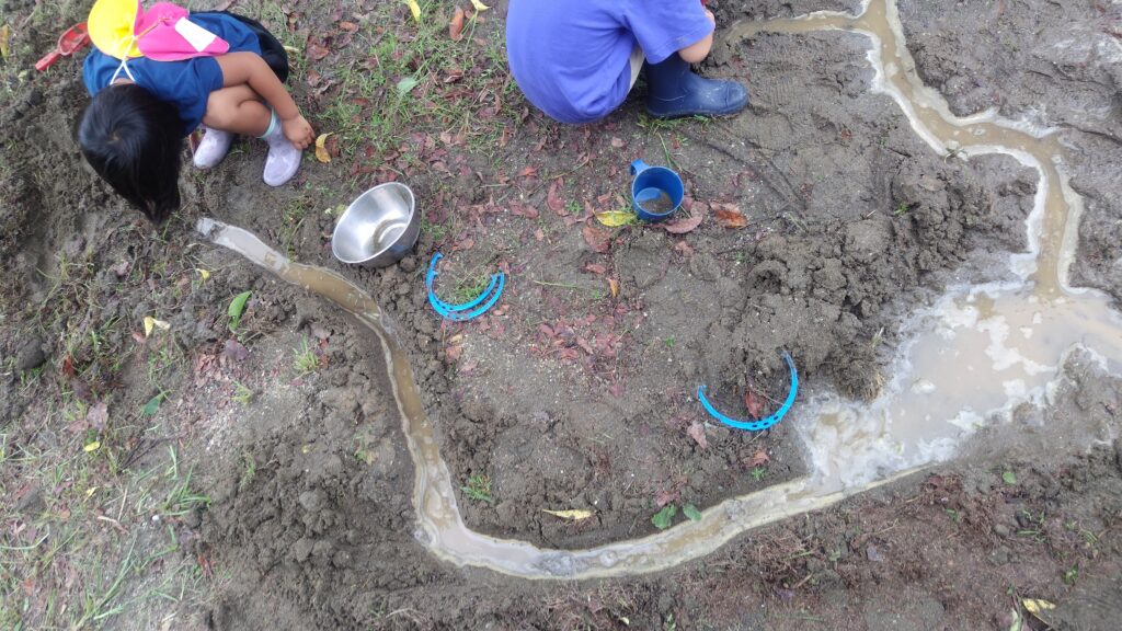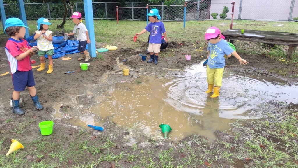 雨が止んだので、子どもたちは園庭にできた水たまりの周辺で