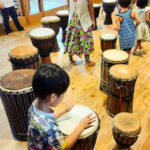 複数のジェンベを使って音楽表現を楽しむこども園の園児たち